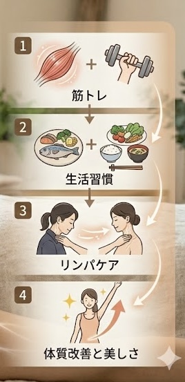 筋肉をつけることで基礎代謝が上がり、リンパの流れも活性化されます。